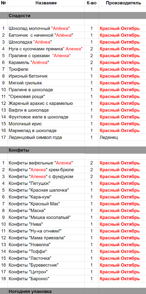 Шоколад молочный "Алёнка" (1 шт), Батончик  с начинкой "Алёнка" (1 шт), Шоколадка "Алёнка" (1 шт), Вафли с начинкой " Аленка" (2 шт), Пралине с орехами "Аленка" (2 шт), Карамель "Алёнка" (2 шт), Трюфели (1 шт), Ирисный батончик (1 шт), Мягкий грильяж (1 шт), "Ореховая роща" (1 шт), Жареный арахис с карамелью (1 шт), Вафли в шоколаде (1 шт), Фруктовое желе в шоколаде (1 шт), Молочный ирис (1 шт), Мармелад в шоколаде (1 шт), Конфеты вафельные "Аленка" (2 шт), Конфеты "Аленка" крем-брюле (2 шт), Конфеты "Аленка" с фундуком (2 шт), Конфеты "Петушок" (1 шт), Конфеты "Красная шапочка" (1 шт), Конфеты "Кара-кум" (1 шт), Конфеты "Красный Мак" (1 шт), Конфеты "Маска" (1 шт), Конфеты "Мишка косолапый" (1 шт), Конфеты "Нива" (1 шт), Конфеты "Ну-ка отними!" (1 шт), Конфеты "Киви" (1 шт), Конфеты "Мама приехала" (1 шт), Конфеты "Toффи" (1 шт), Конфеты "Ласточка" (1 шт), Конфеты "Буревестник" (1 шт), Конфеты "Цитрон" (1 шт), Конфеты "Барокко" (1 шт), Конфеты "Лебедушка" (1 шт)