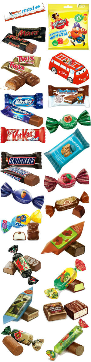 Молочный шоколад "Аленка" (3 шт), Батончик "Аленка" (3 шт), Мармелад в шоколаде (3 шт), Трюфели (3 шт), Мягкий грильяж (3 шт), Мягкий грильяж (3 шт),  Молочный ирис (3 шт), Ирисный батончик (3 шт), "Ореховая роща" (3 шт), Батончик сливочный (3 шт), Конфеты "Ну-ка отними !" (3 шт), Конфеты "Кара-кум" (3 шт), Конфеты "Красная шапочка" (3 шт), Конфеты "Мишка косолапый" (3 шт), Конфеты "Тоффи" (3 шт), Конфеты "MegaDrive" (3 шт), Конфеты "Аленка" (3 шт), Конфеты "Красный Мак" (3 шт), Конфеты "Маска" (3 шт), Конфеты "Петушок" (3 шт),  Конфеты "Нива" (3 шт)